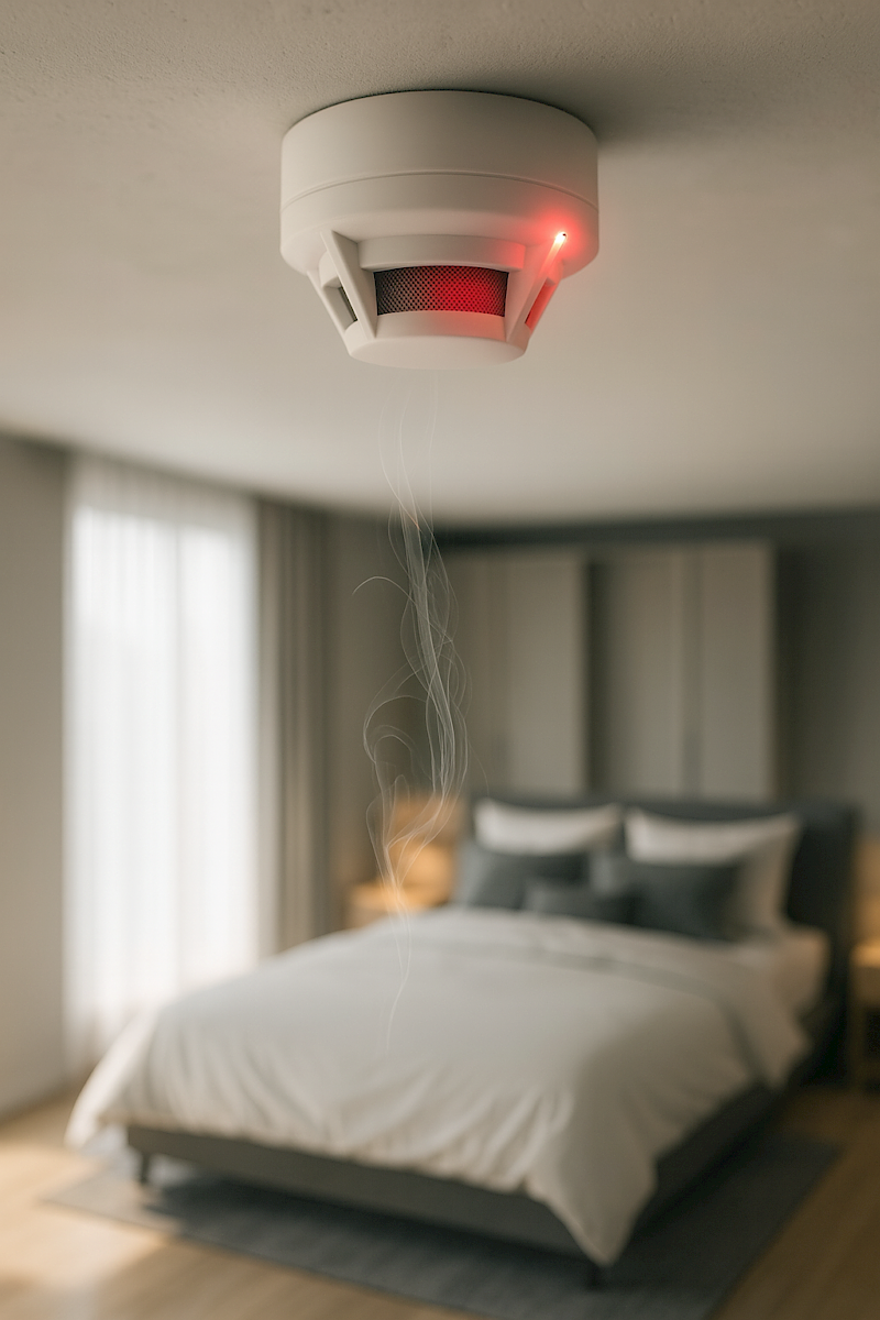 Duman Dedektörleri: Ortamdaki dumanı algılayan dedektörlerdir. Optik duman dedektörleri en yaygın tip olup, duman partiküllerinin fotoelektrik sensörle tespiti prensibiyle çalışır. İyonizasyon tipi duman dedektörleri de mevcuttur ancak günümüzde otel uygulamalarında genellikle optik dedektörler tercih edilir. Duman dedektörleri, yavaş gelişen ve uzun süre tüten yangınlarda (örneğin, yatakta sigara unutulması sonucu çıkan yangın) erken uyarı sağlar.