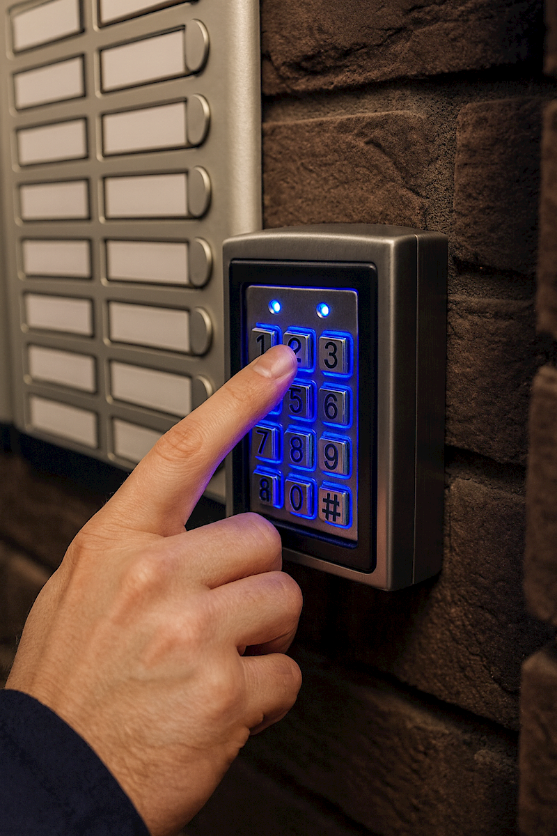 Şifre panelleri, bir diğer erişim kontrol cihazı türüdür. Duvar üzerindeki bir tuş takımı vasıtasıyla kullanıcı kod girer ve sistem bu kodun geçerli olup olmadığına bakar. Şifreli kapı kilitlerinin yanı sıra, kart+şifre kombinasyonu kullanan cihazlar da vardır (örneğin önce kartınızı okutup sonra panelde kendi PIN kodunuzu girmeniz gerekebilir). Bu ikili doğrulama cihazları, tek başına karta kıyasla daha güvenli bir çözüm sunar ve bankalar, veri merkezleri gibi yerlerde tercih edilir.